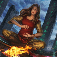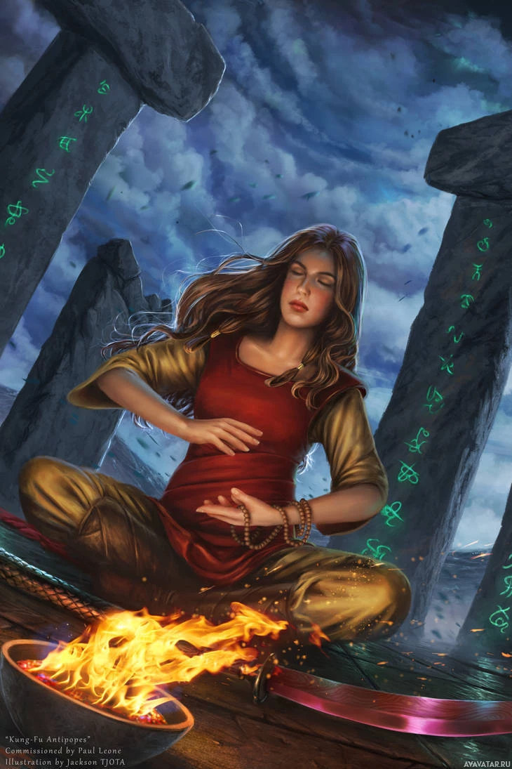 long hair. In front of her are two bowls on the ground; one is placed directly on the floor, and the other is resting on a surface which could be another stone or part of an altar. There is fire burning in between these items. The artwork suggests themes of mysticism, ritual, or spirituality, given the character's pose and the setting.
