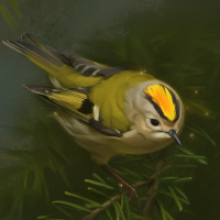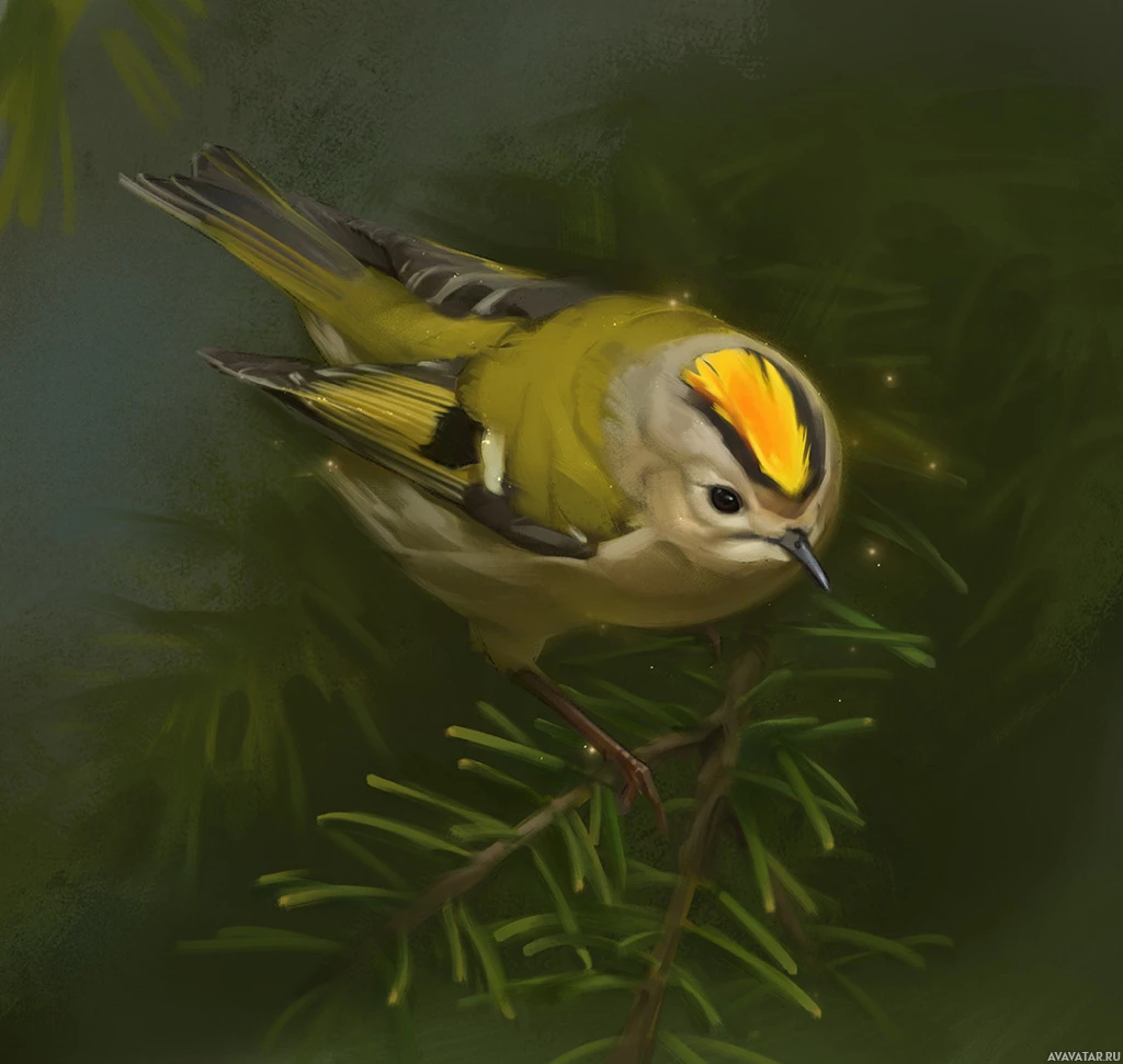 На картинке изображена маленькая птичка, сидящая на чем-то похожем на ветку хвойного дерева. У птицы желто-белое оперение с характерными полосками у глаз, характерными для многих видов семейства камышевочных. Она удобно расположилась на фоне зеленой хвои.
