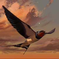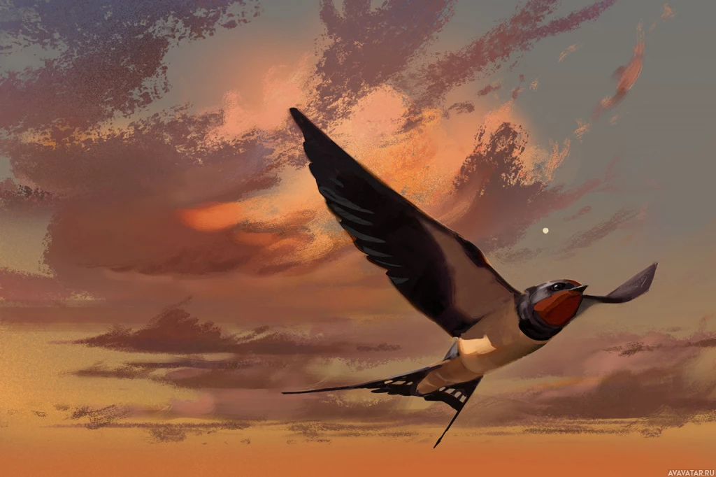 На картинке изображена птица в полете. Судя по всему, это длиннокрылая птица с узорчатыми крыльями и хвостом, возможно, аист или похожий вид, на фоне неба, окрашенного в оранжевые и розовые тона, что указывает на восход или закат солнца.