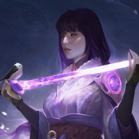 a female character holding two purple swords crossed before her. She appears to be wearing traditional Japanese armor, which includes what seems to be a kimono and possibly a headpiece or helmet. A