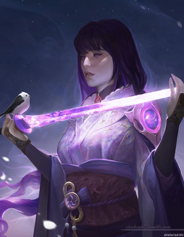 small bird is perched on one of the swords, adding a delicate touch to the scene. The character has brunette hair and is looking down with