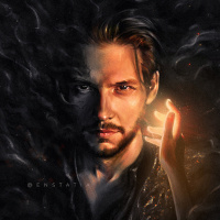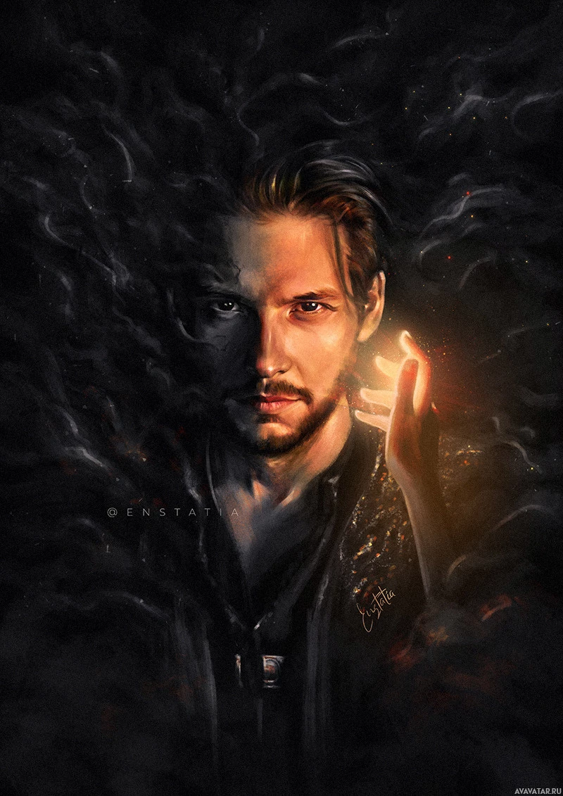 a nighttime scene, and there are small flames or sparks near his hand, which could imply that he's casting a spell or performing some magical act. The overall tone of the image is dramatic and somewhat mysterious.
