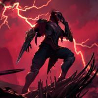 lightning bolts in the background, which suggests an intense or dramatic setting. The warrior is wielding what appears to be a sword or staff, ready for battle. The overall atmosphere is one of a high-energy, possibly
