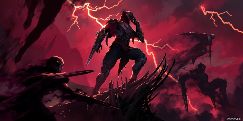 a fantasy scene featuring a warrior standing amidst chaotic and dark elements. There are red