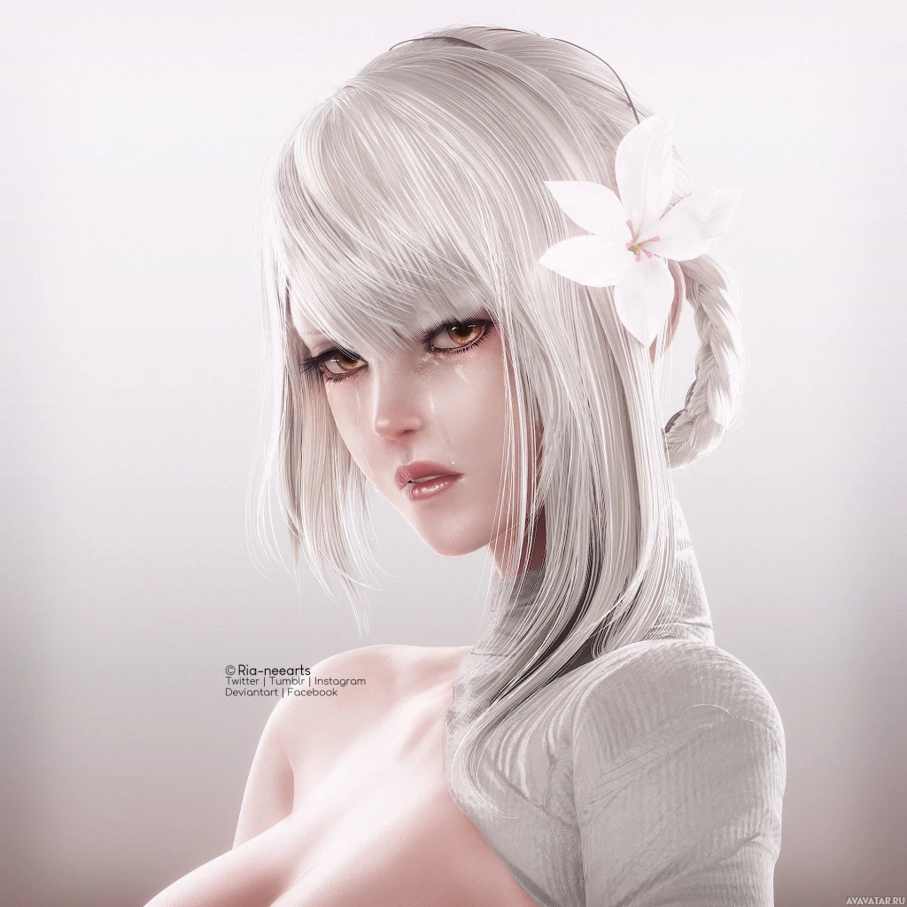 a sleeveless top and has a pearl or flower adornment in her hair. There are also tears visible on her face, indicating she might be crying or showing