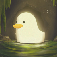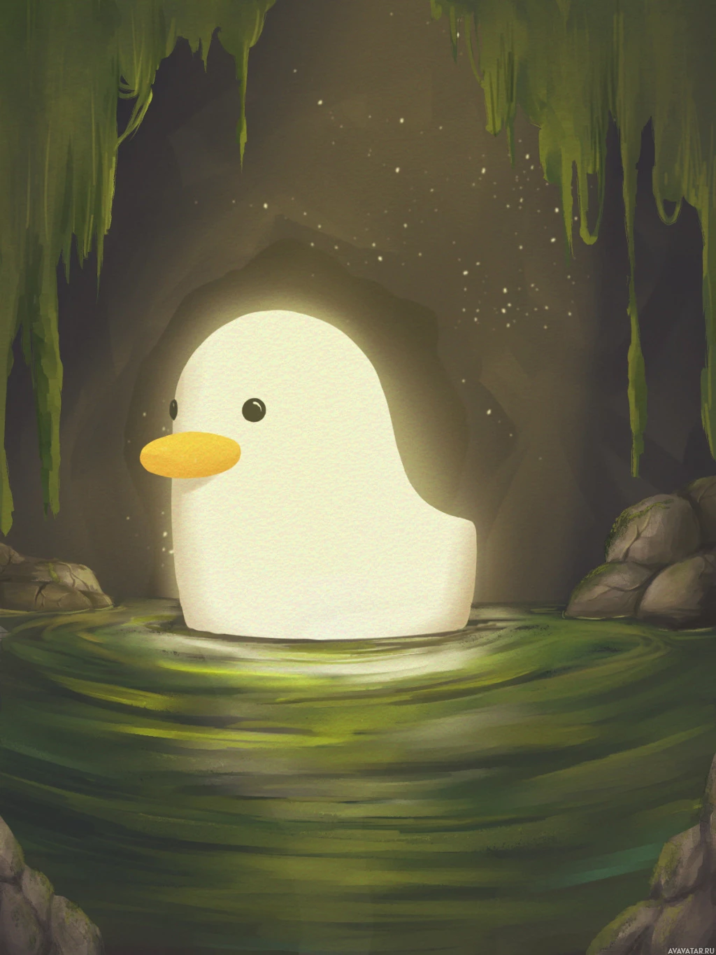 The image depicts a cartoon-style duckling with large eyes, sitting in