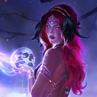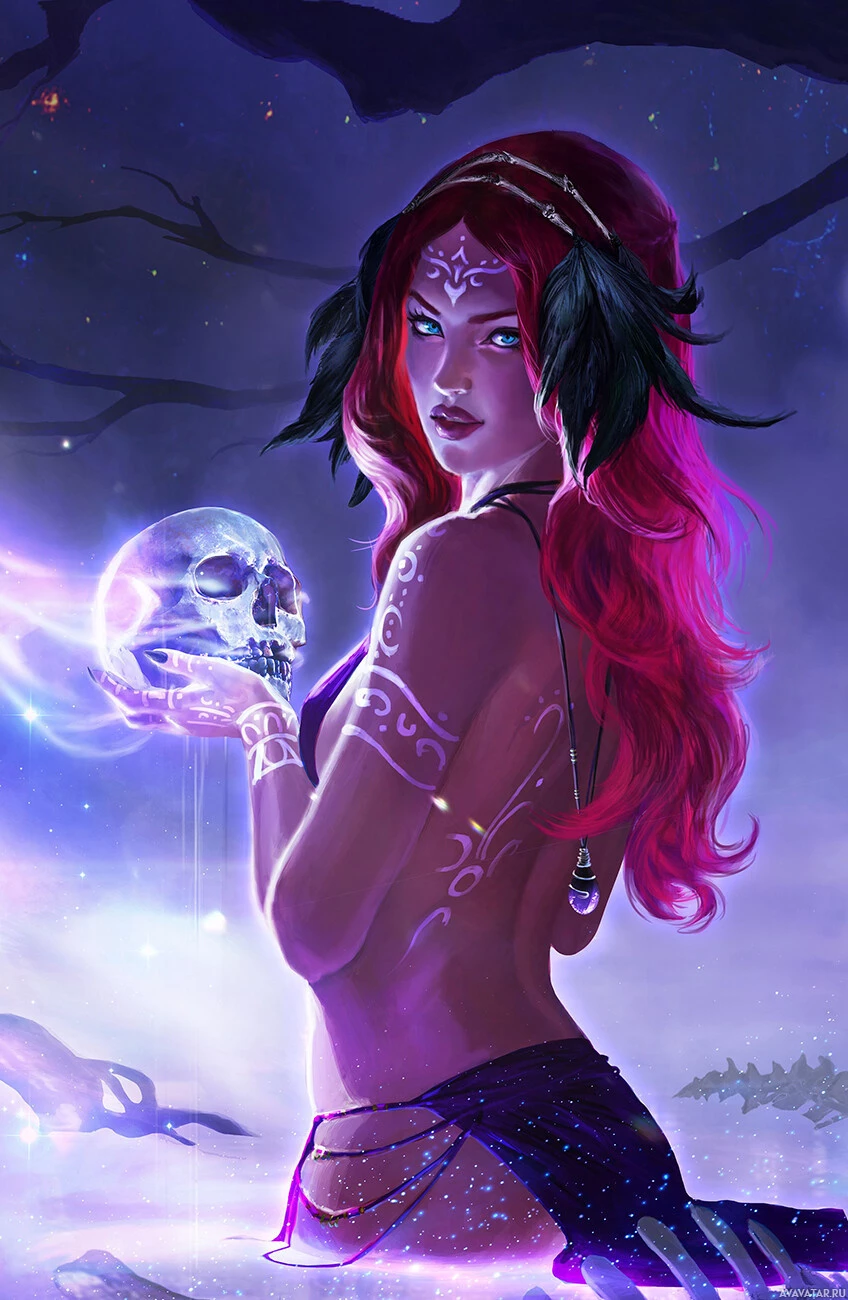 a skull decoration that adds to her mysterious and possibly fantastical appearance. The background suggests a magical or mystical setting with