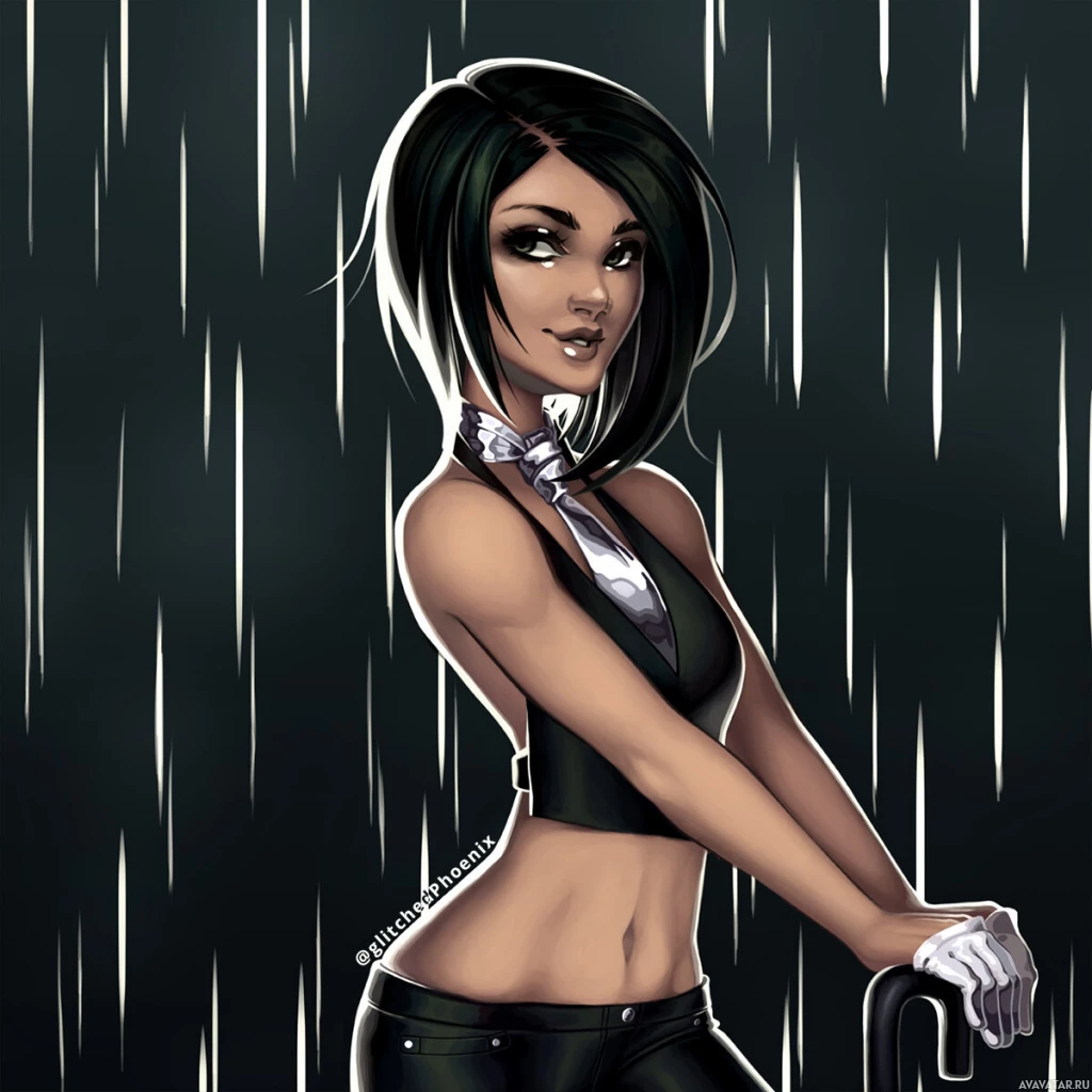 rain droplets. Her pose is confident, and she seems to be posing for the viewer.