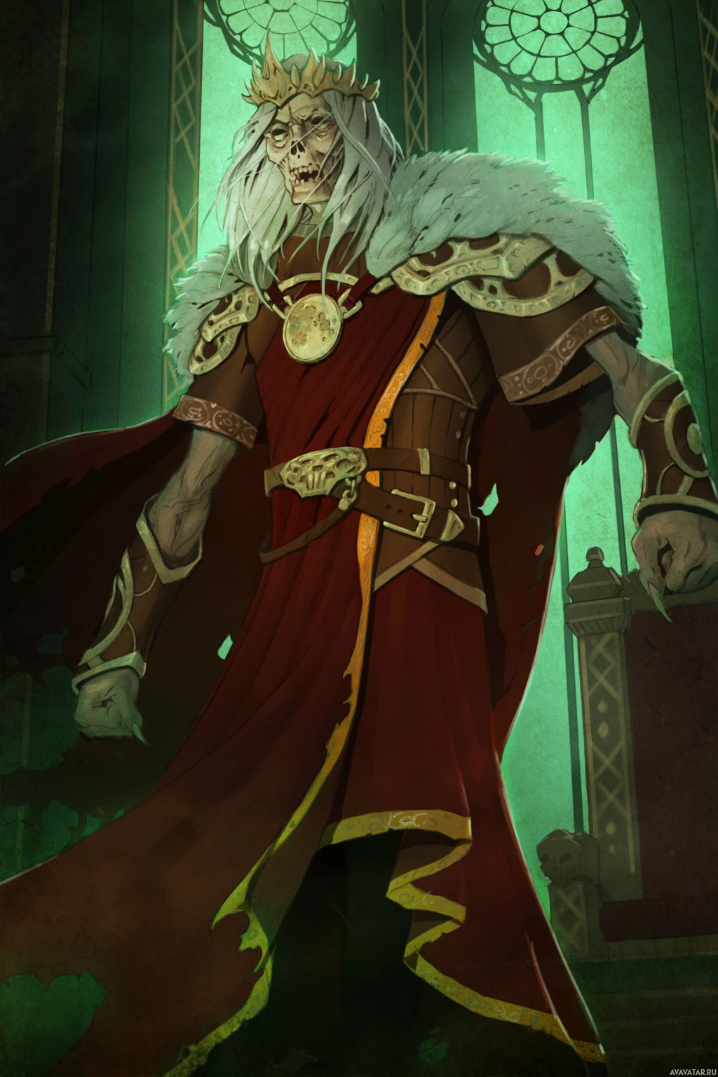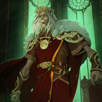 a fantasy scene featuring a character that appears to be a king or royal figure. The person has long