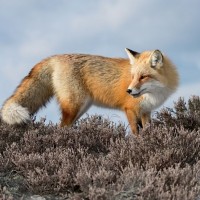 The image shows a fox, specifically it appears to be a red or orange fox with distinctive reddish-brown fur. It's standing on what looks like an exposed rock or grassy area with a view of the sky in the background.