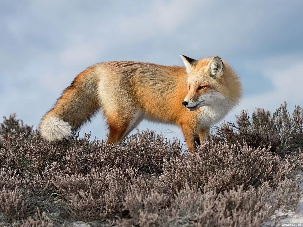 На картинке изображена лиса, в частности, это красная или оранжевая лиса с характерным красновато-коричневым мехом. Он стоит на том, что выглядит как открытая скала или травянистая местность с видом на небо на заднем плане.