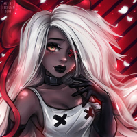 red background that seems to glow from the bottom up, enhancing her dramatic presence.
