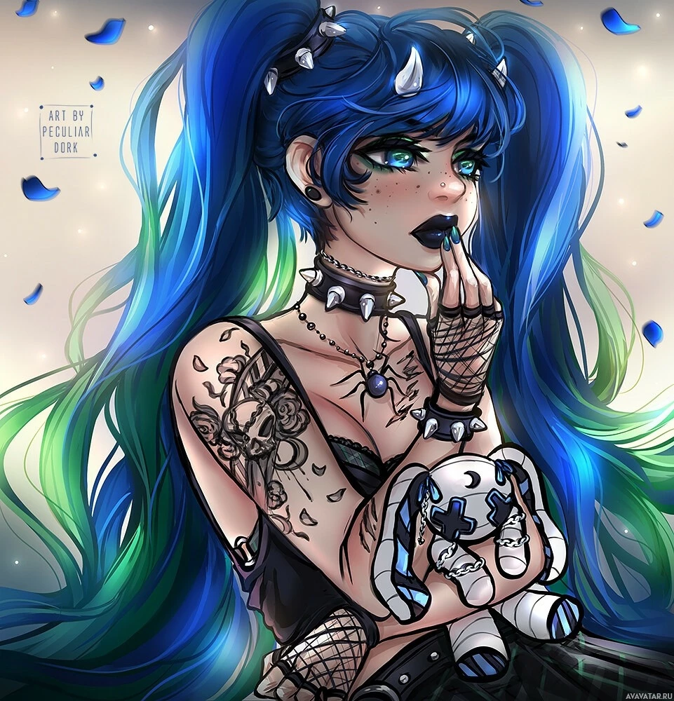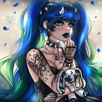 dark clothing and makeup that includes elements like blue eyeshadow, eyeliner, and what looks like piercings or tattoos on her face. Her hands are holding what seems to be a small robotic creature with