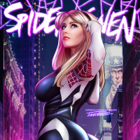 a comic book featuring the character Gwen Stacy, who is known for her role as Spider-Woman. She is depicted in a costume that resembles that of Spider-Man, complete with webbing details and