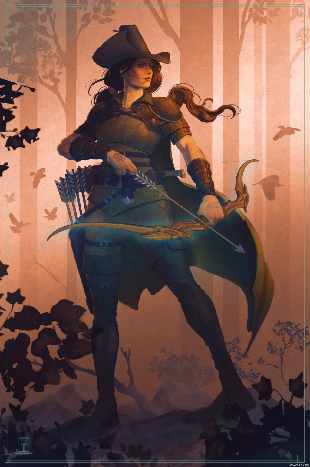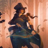 an illustrated character, likely a female, dressed in historical or fantasy attire that includes a hat and what appears to be a bow. She is holding a bow in her hands and stands amidst a forest setting with trees and foliage around her. Her pose suggests she might be on the move or preparing to shoot an arrow. The character's outfit gives off a medieval or renaissance vibe, but there are also