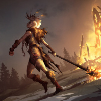 a female character dressed in what appears to be historical or fantasy attire, possibly a warrior or huntress. She is standing in front of a raging fire, with the flames reaching high into the air and emitting bright orange-