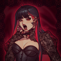 a female character with dark hair and red accents, possibly suggesting a vampire or dark fantasy theme. She is depicted wearing a black lace top with red details and has an earring on one ear. Her expression appears to be one of excitement or surprise as she seems to be speaking or making