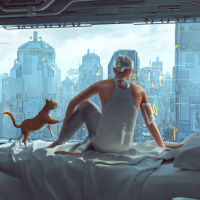 protective gear. Beside him lies a cat, which seems to be a robotic pet, adding to