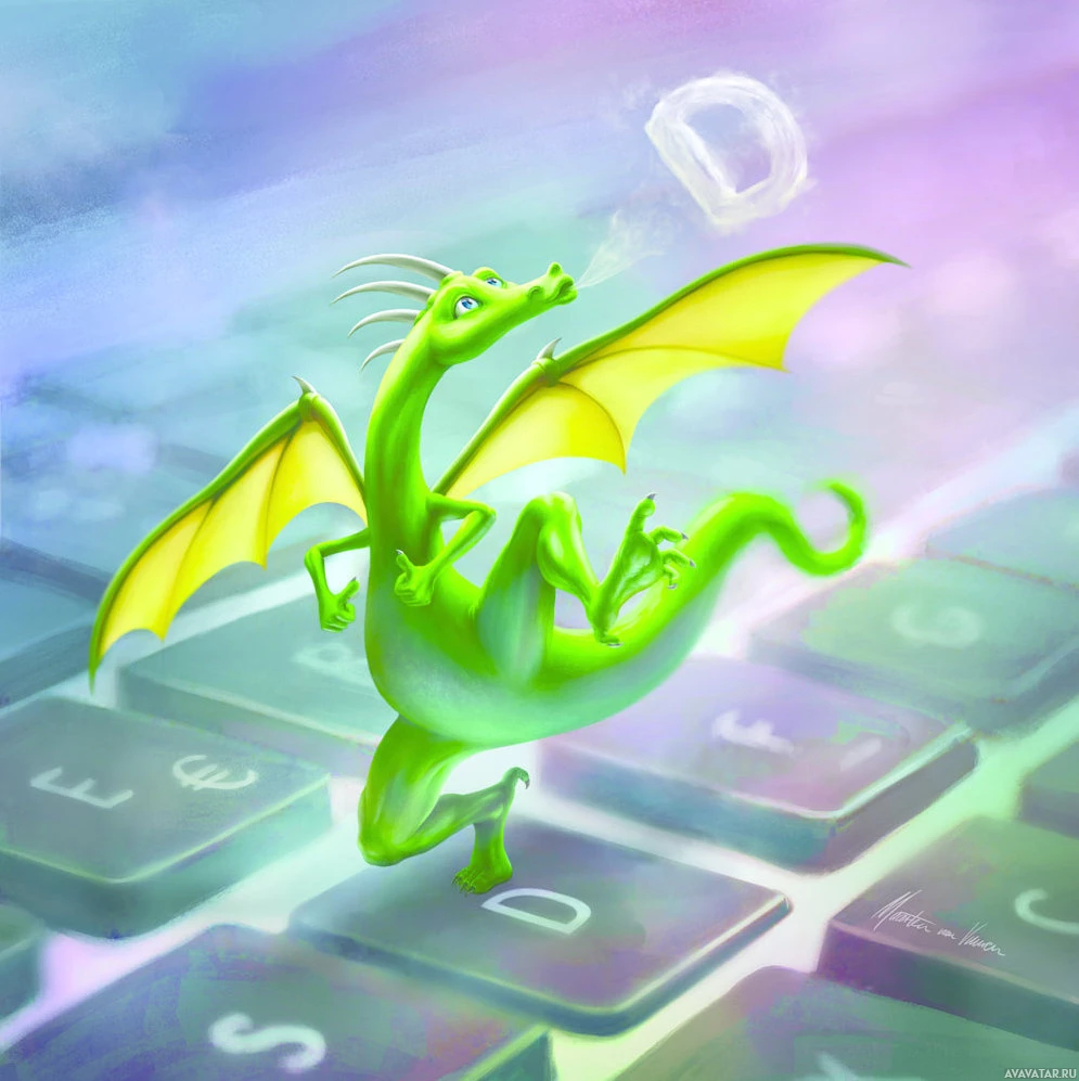 green skin and yellow wings. It appears to be dancing or performing an action on top of a keyboard. The background has a soft, dreamlike quality with