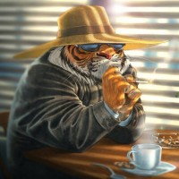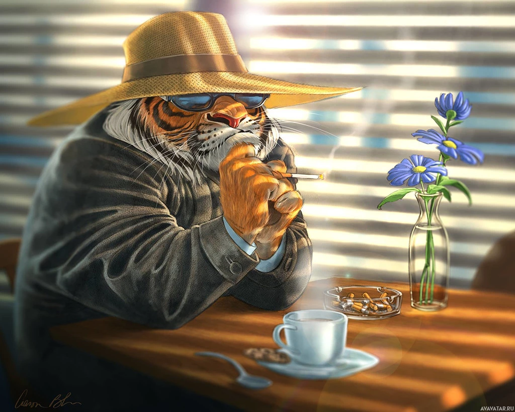 a cup of coffee in its paw and appears to be smoking a cigarette with its other paw. There are also flowers on the table next to the tiger. The setting seems to be an indoor space, possibly a café or a lounge area, indicated by the presence of the table, chairs, and