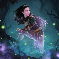 a dynamic pose, suggesting movement or action, possibly casting a spell or interacting with the magical environment she inhabits. The setting includes trees with