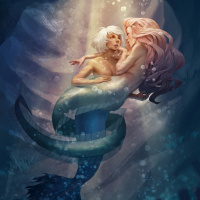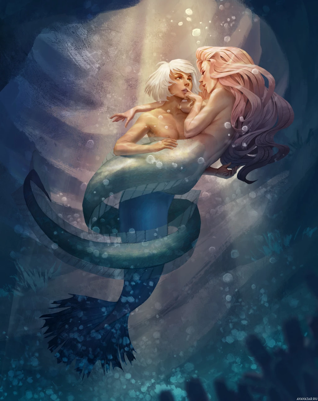a fantasy scene featuring two mermaids in an underwater setting. On the left, there is a mermaid with a tail and scales, embracing another individual who appears to be human-like but has features reminiscent of a fish or