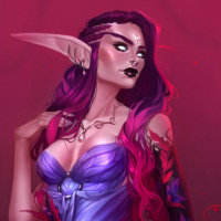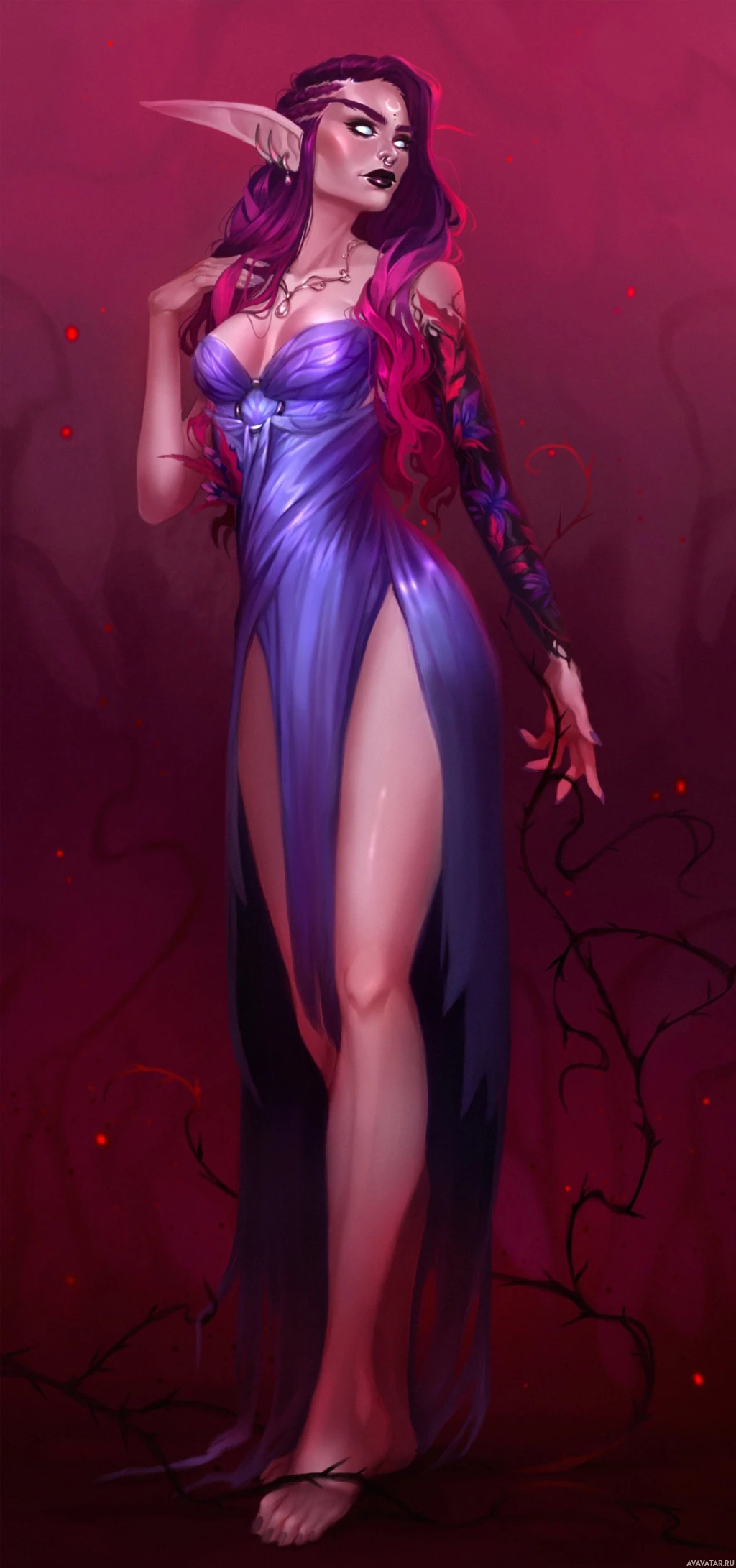 purple hair and is wearing a blue, flowing dress that seems to suggest a magical or mythological context. The setting is dark and moody, with red and black accents that add to