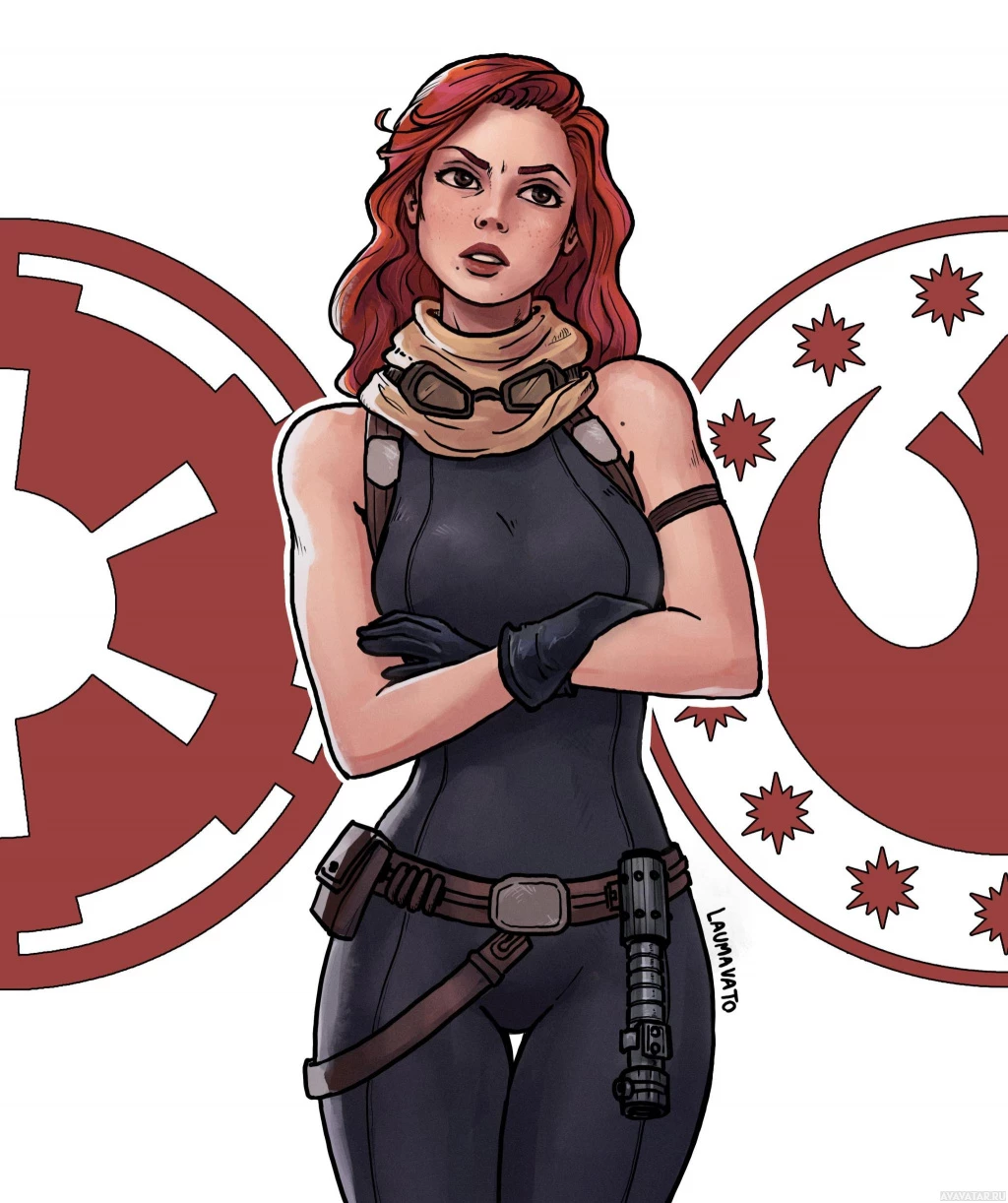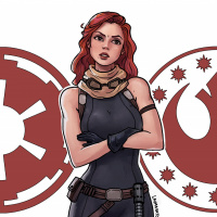 a female character with red hair, wearing what appears to be a costume inspired by the Star Wars franchise. She has on a black top with some accessories resembling gear from that universe and is standing between two circular symbols that are associated with