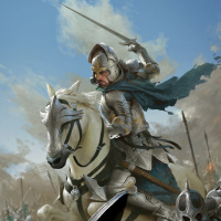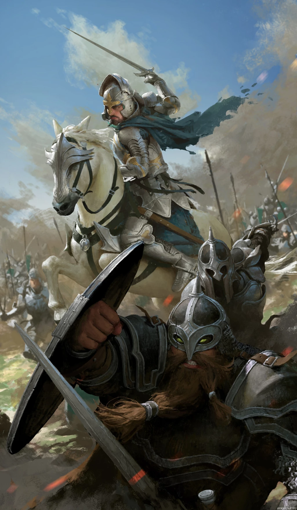 a rider on a horse, wielding a sword and preparing to charge into battle, while another warrior stands defensively with his shield raised. A