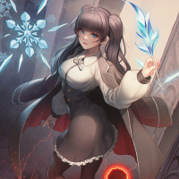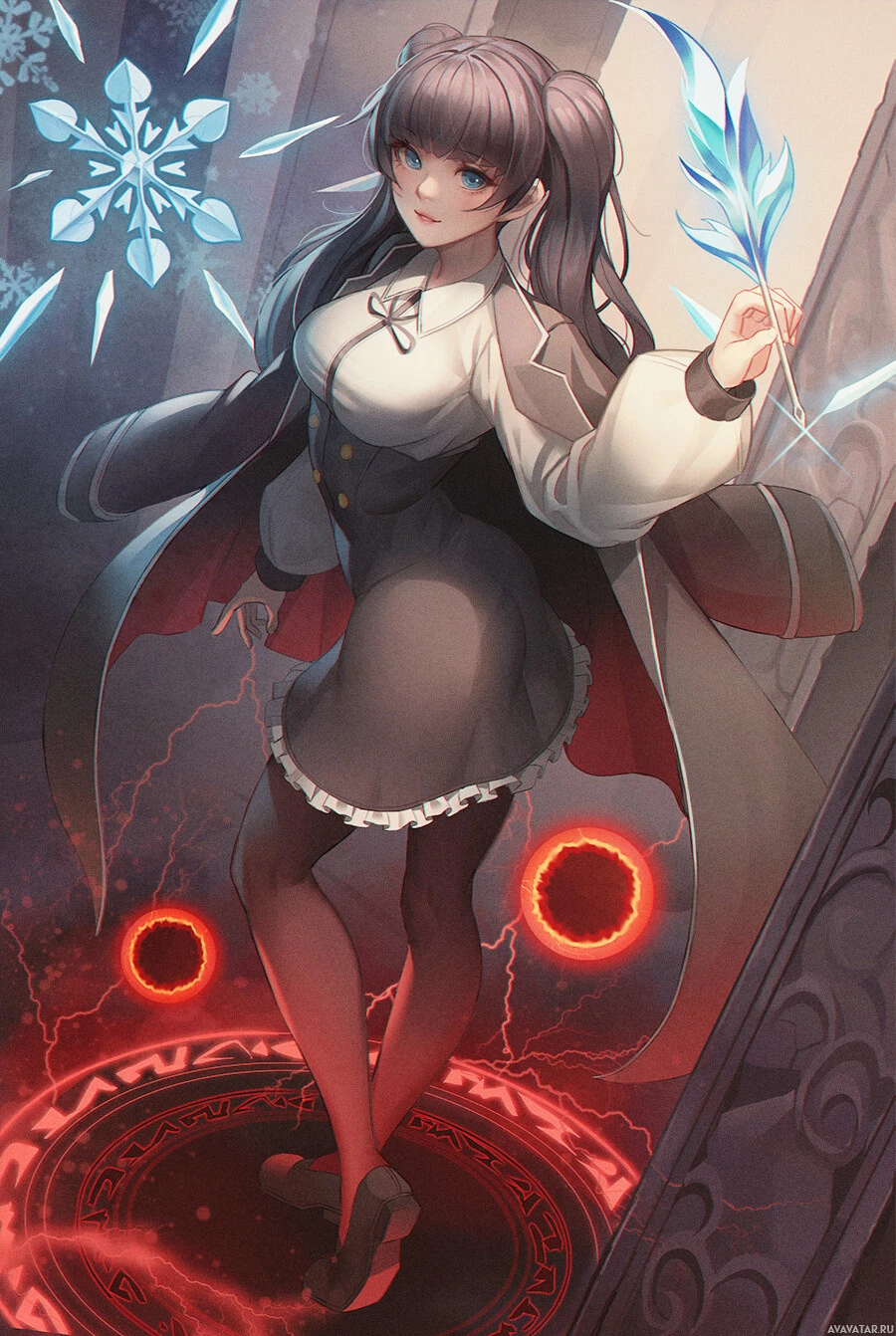 На картинке изображен анимационный персонаж, девушка с темными волосами и голубыми глазами. Она одета в школьную форму и держит в руке посох. Фон предполагает магическую или мистическую обстановку, а вокруг нее - что-то похожее на ледяные или кристаллические образования. Стиль оформления напоминает японскую анимацию (аниме).