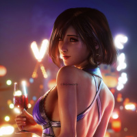 a brunette woman holding what seems to be a glass of wine or champagne while standing in an illuminated environment that suggests a futuristic setting typical for the game's theme. The character is wearing a tight, sleeveless outfit and has