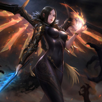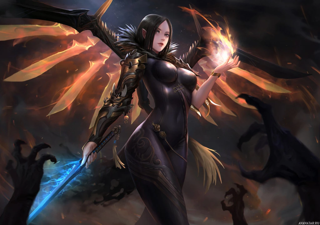 large wings on her back which suggests she might have some sort of mystical or demonic powers. The background indicates a chaotic