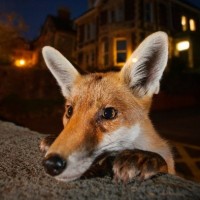 a red fox peeking out from behind what appears to be a cement wall or barrier. The setting looks like it could be