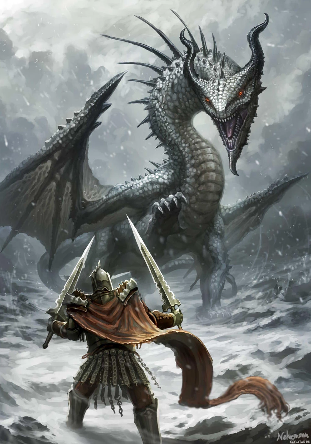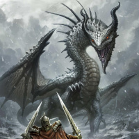 sharp claws, appears to be in a defensive or aggressive posture. Both the knight and the dragon are set against a dramatic backdrop of