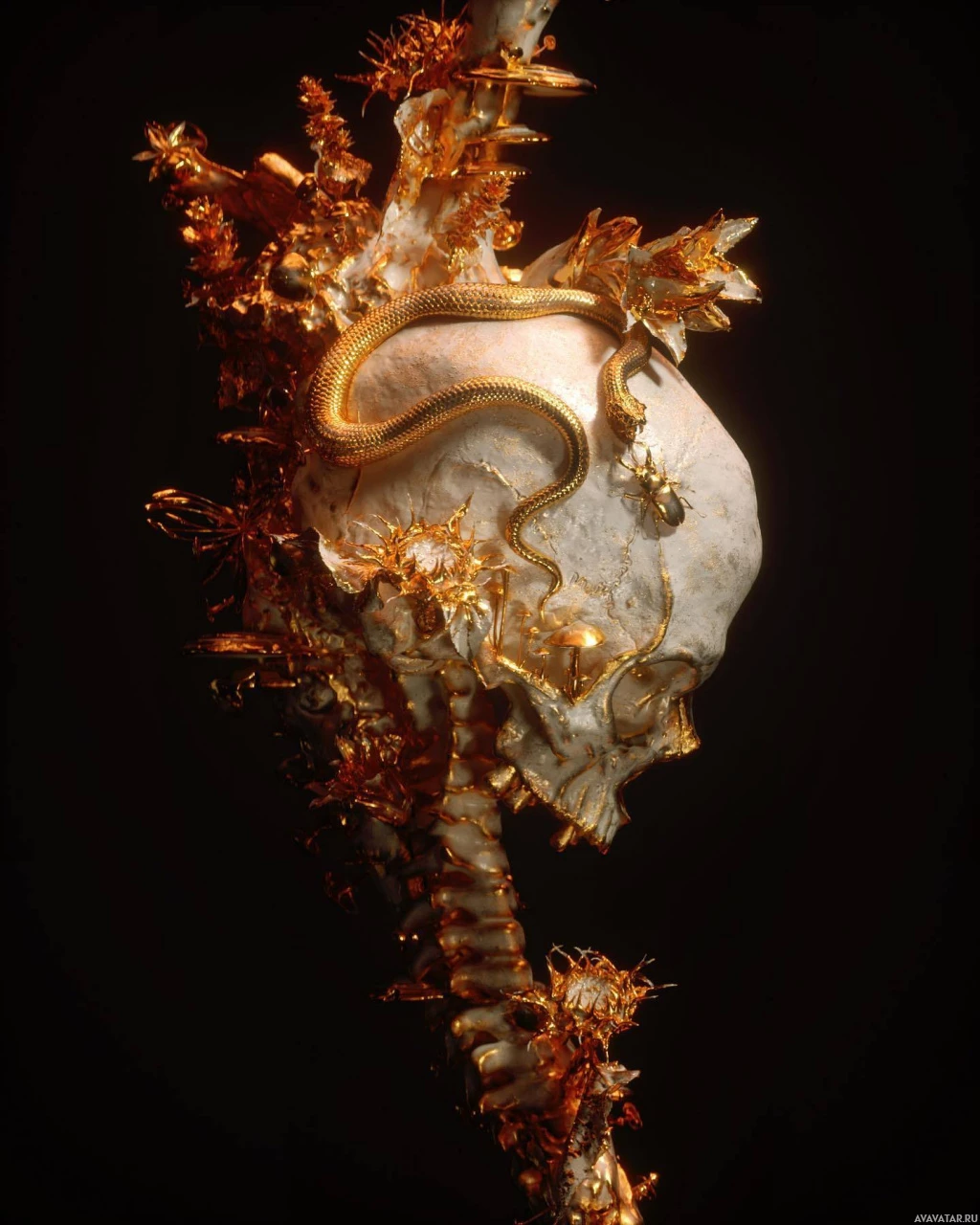 human skull. The background is dark, which emphasizes the details of the skull's embellishments. This picture may also be interpreted as a representation of beauty and decay or as