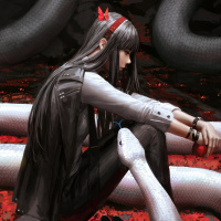 hair accessories and appears to be sitting on the ground, her posture relaxed. In front of her are two snakes; one is white and slithering towards her feet, while the other is silver and coiled around the girl's legs. The background is dark with a hint of