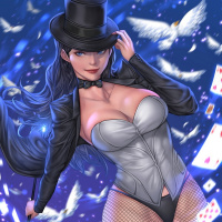 The image shows a stylized illustration of a character named Zatanna, who is a fictional superheroine from
