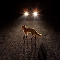 road at night. The fox appears to be looking directly at the camera, and there are vehicle lights in the background that are shining on the animal, creating