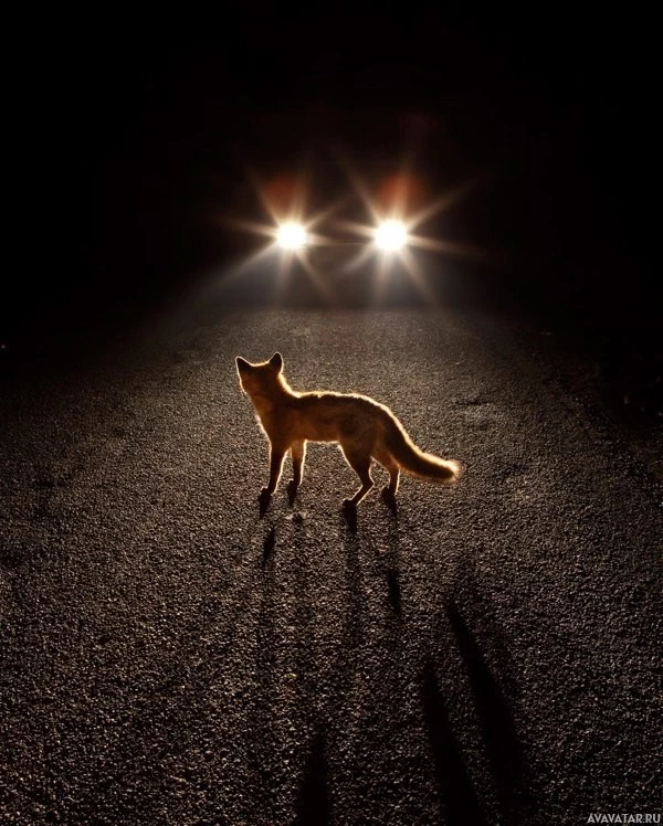 a stark contrast between the dark surroundings and the bright lights from the cars. This image captures a moment where wildlife encounters