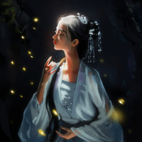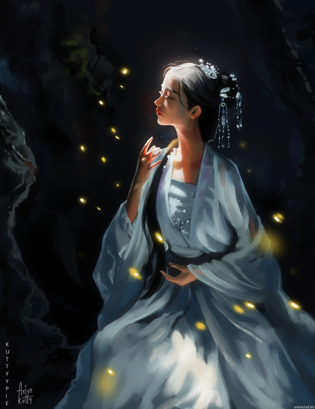 small lights floating around her face and shoulders, adding an ethereal quality to the scene. The background features dark rocks, enhancing