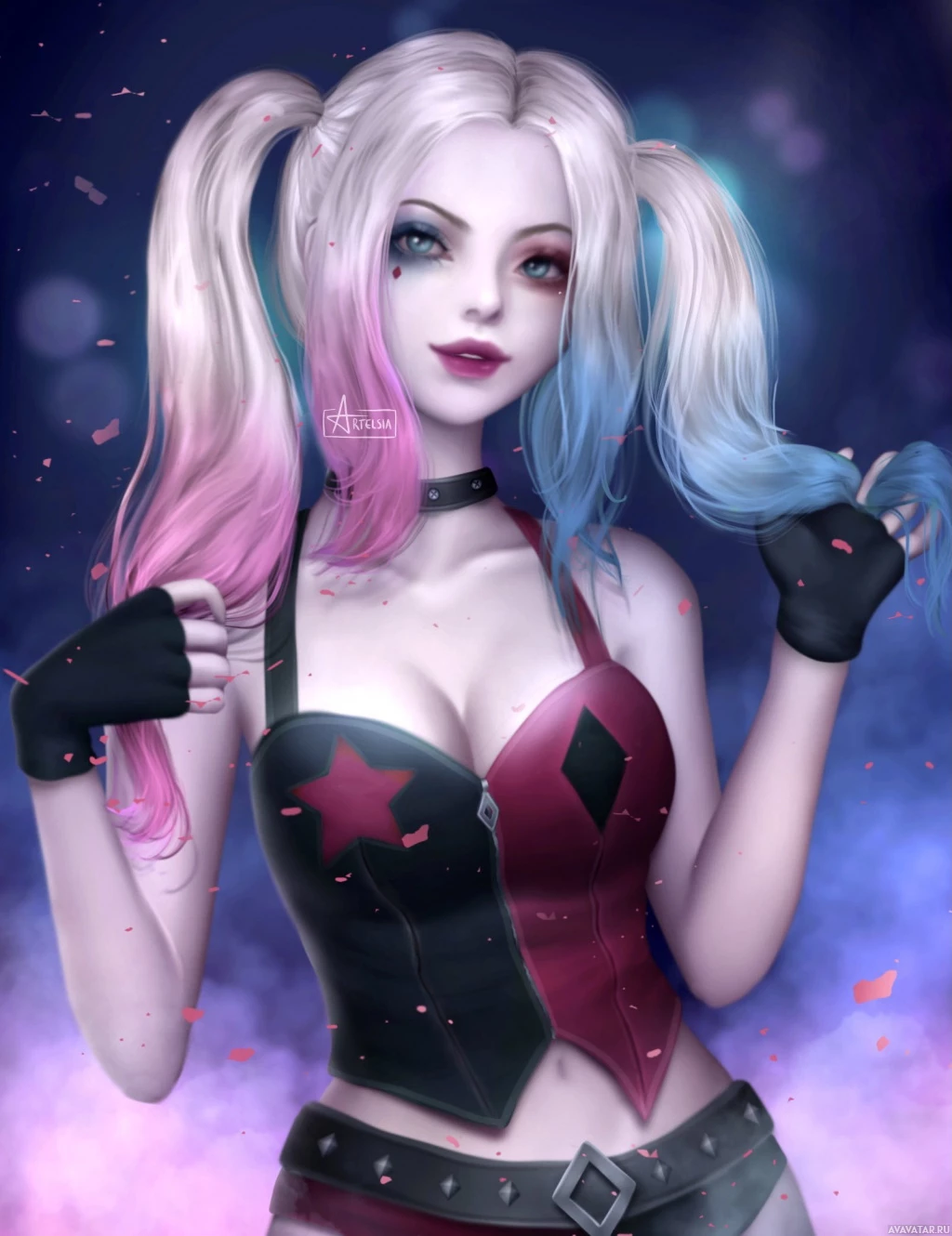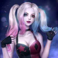 toned hair (one half in pink and the other in blue), wearing a black and red costume with bat ears and holding a mallet. In this particular image, Harley Quinn is styled as