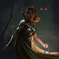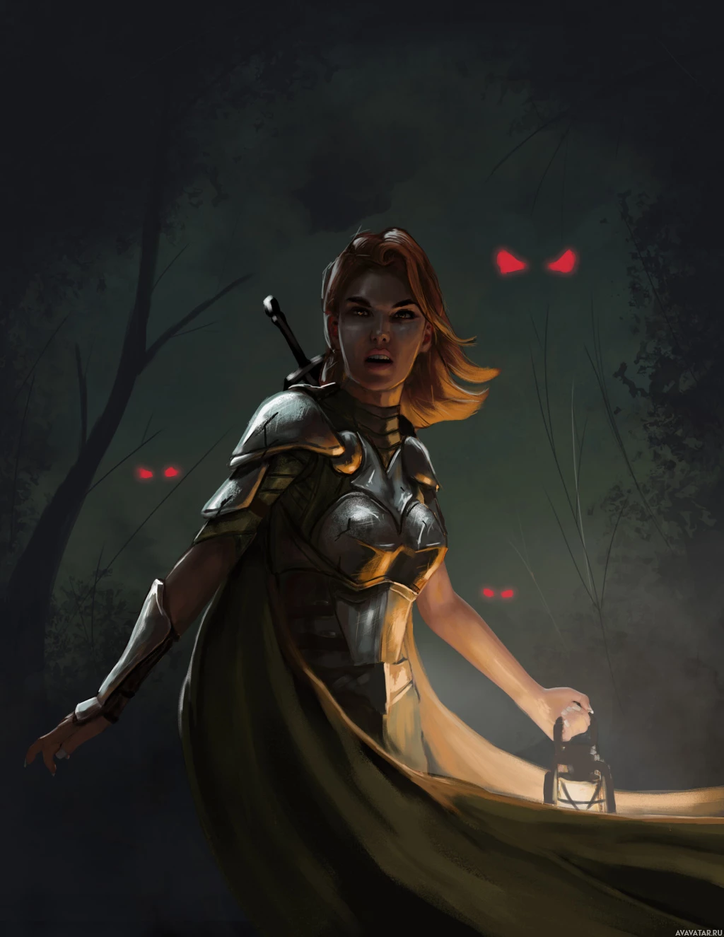 red hair and is wearing armor, suggesting she may be a warrior or adventurer of some sort. She's also holding a lantern, which could imply that it might be dark outside, possibly in the middle of a forest or