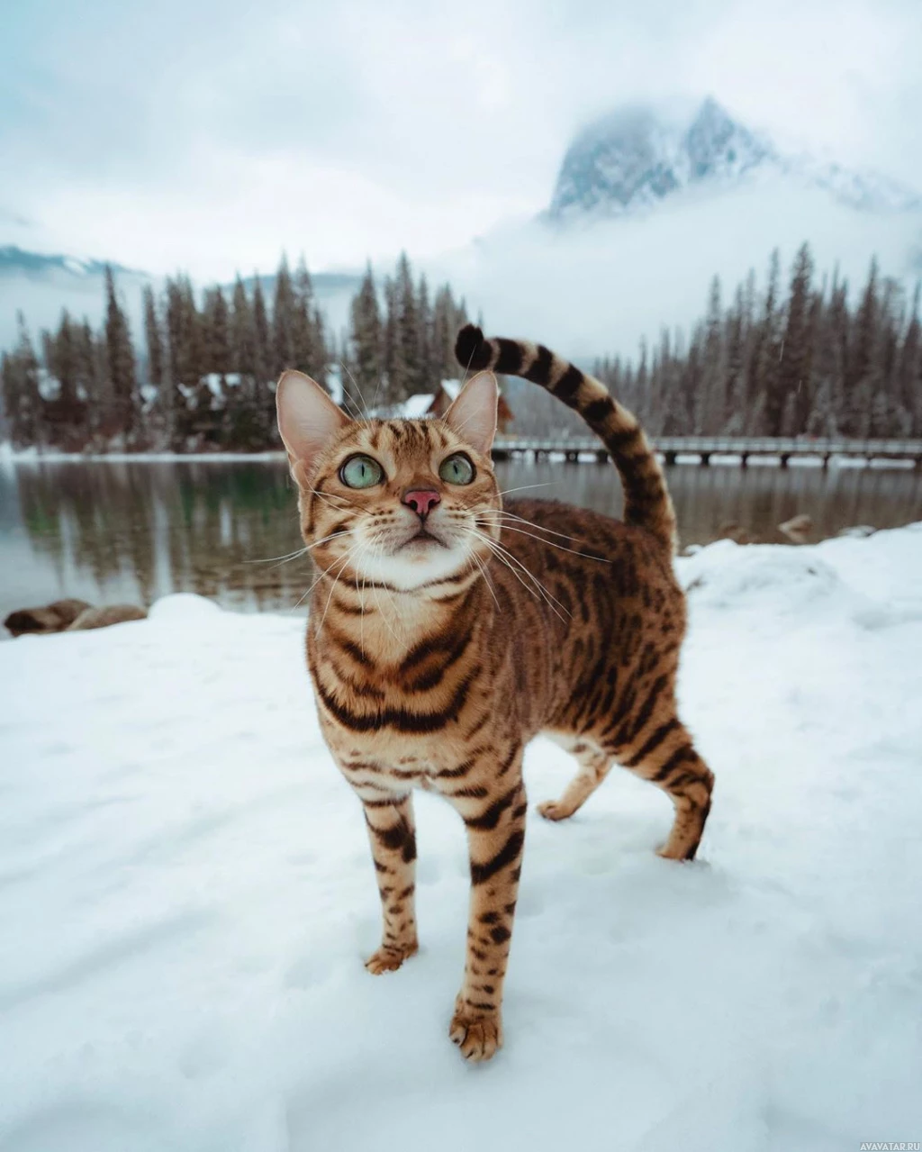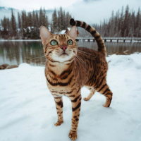 covered ground. The cat's fur is patterned with stripes and swirls, typical of the breed. It appears to be in a natural