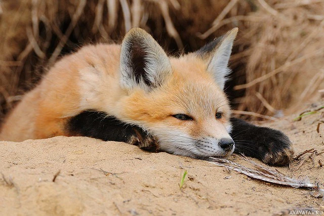 На картинке красная лиса лежит на том, что кажется грязью или песчаной поверхностью. Лиса имеет закрытые глаза и, кажется, отдыхает или, возможно, спит.
