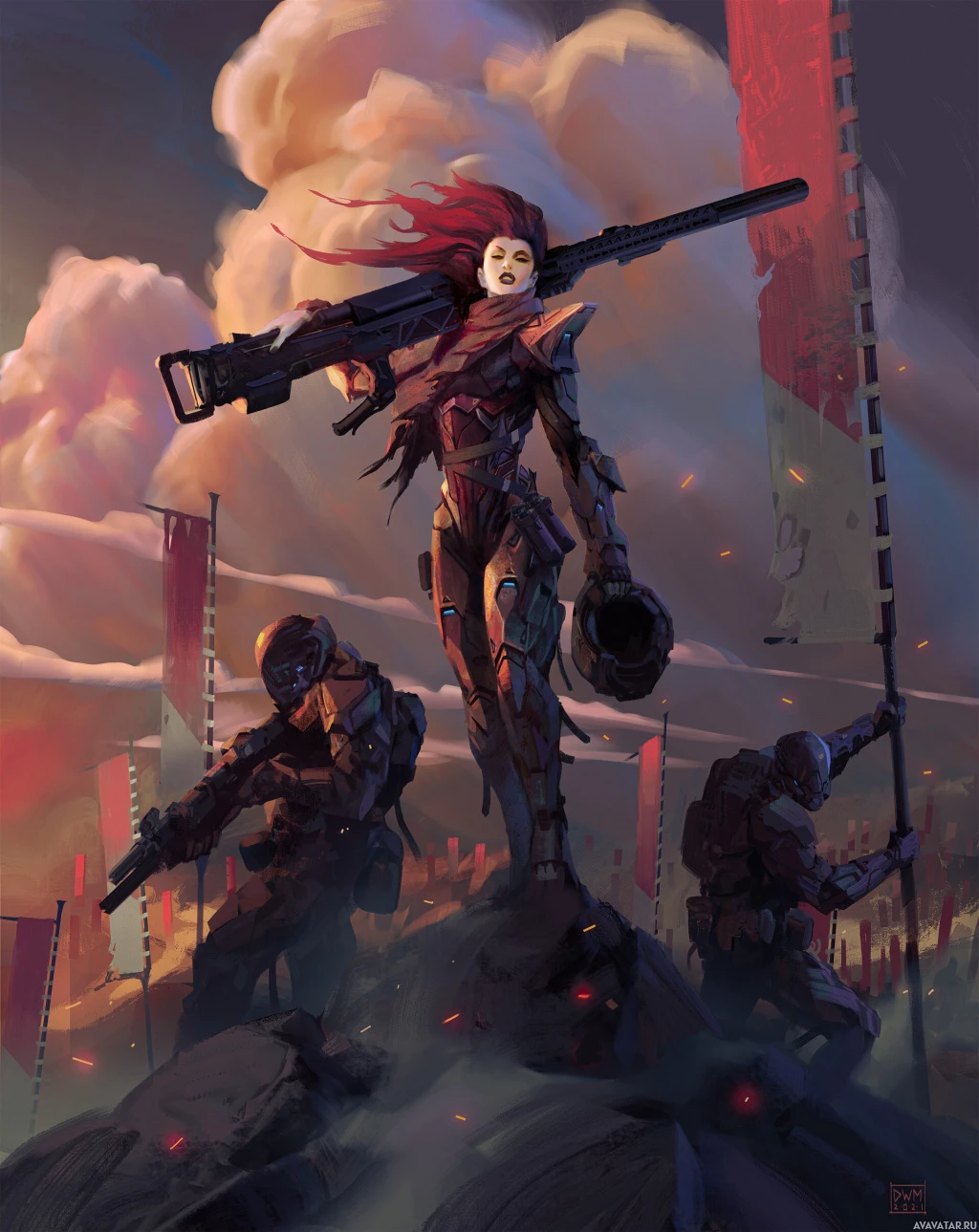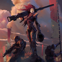 a female character with red hair. She appears to be holding or aiming a weapon and wearing some form of armor that suggests she could be part of