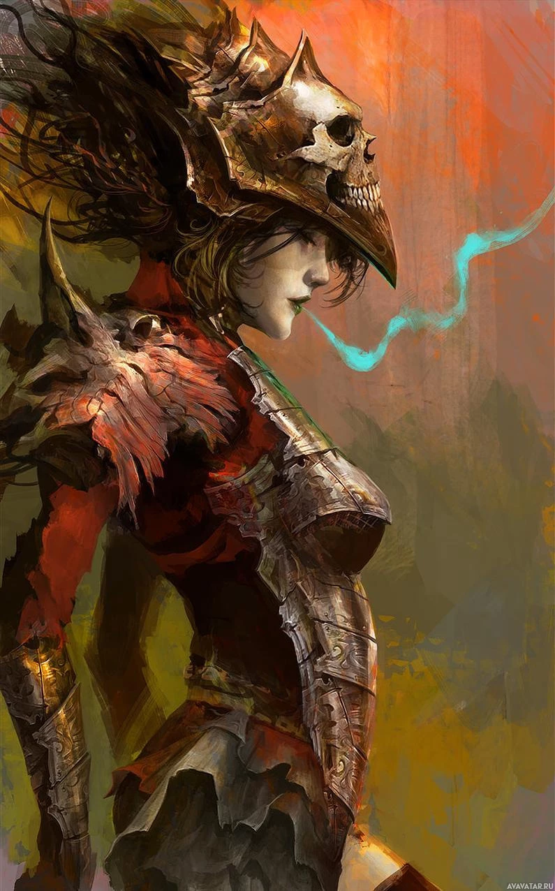 a female character who appears to be from a fantasy or science fiction setting. She is wearing armor and has a skull for a helmet, which gives her