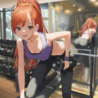 a sports outfit and seems to be taking a break or resting after exercising, as she has her hands on her knees and is smiling. There are weights in the background, indicating that she is in an area designated for