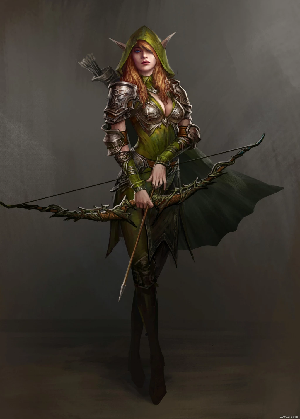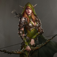 the pointed ears and hood, which suggests a fantasy or elven design. She is holding a bow, further emphasizing her role as an archer or warrior within this genre. Her attire, including armor with intricate details, adds to her mystical appearance, making her a suitable representation of fantasy elements.