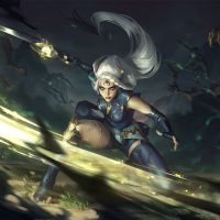 type role within the game. Behind her, there's a dynamic background featuring swirling energy and dark elements that give
