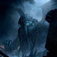 monstrous being who lies dormant in the city of R'lyeh and will one day rise to wreak havoc on the world. The creature is shown with tentacled arms and